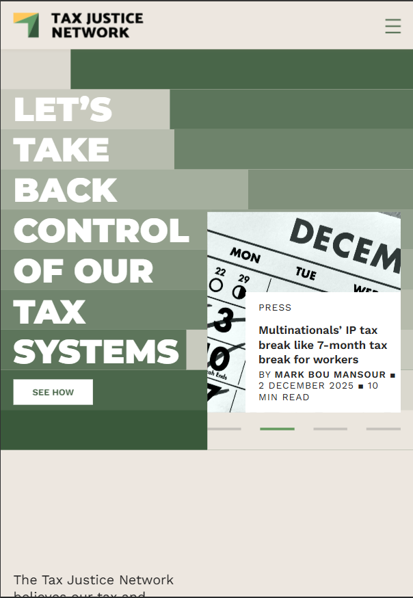 Tax Justice Network is a global research and advocacy organization dedicated to making tax systems fairer, more transparent, and accountable. The network believes that tax and financial systems should work for everyone and not just the wealthy, how unfair tax practices cause inequality, corruption, and economic injustice. Through their website, research reports, data tools, country profiles, indexes, policy trackers, news, blogs, and educational content can be found that explain how tax systems work and how they can be improved.